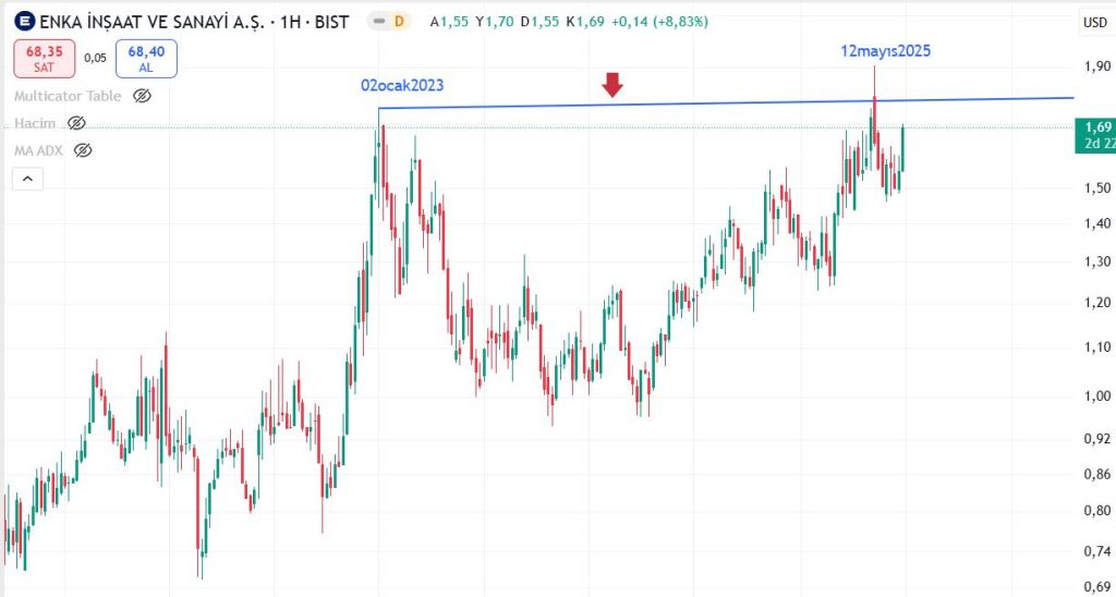İkinci grafik ENKA İnşaat (ENKAI) hissesine aittir ve USD bazında tarihsel olarak tekrarlayan tepe noktalarını göstermektedir: